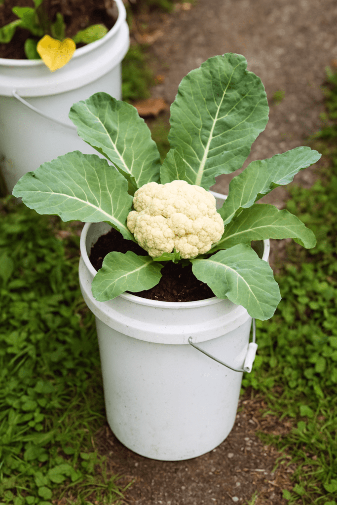 Cauliflowers get big, so they prefer growing individually in your 5-gallon bucket. If you have a baby cauliflower variety, you may be able to plant 2 or 3 per bucket.